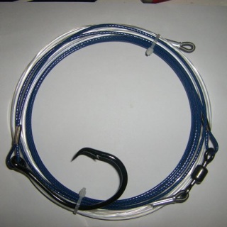 2.5 mts of 296 kg wire (650 lb)bench swagged with 20/0 eagleclaw circle hook ,8/0 commercial quality swivel with loop protectors and 6 metres of 650 lb mono for an overall length of 8.5 metres
