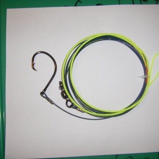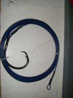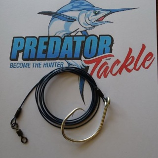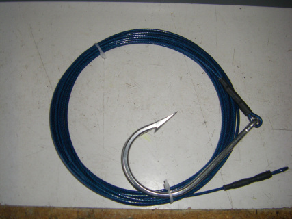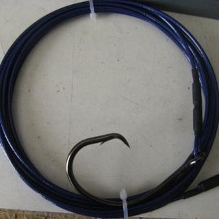 8 mt [26.25 ft] 316 s/s 49 strand nylon coated 296 kg (650lb) shark trace with 16/0 demon circle mustard hook with dual wall shrink wrapped bench swagged crimps. igfa legal