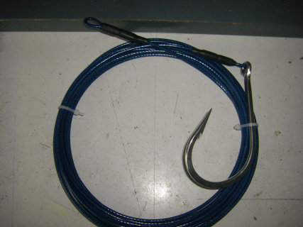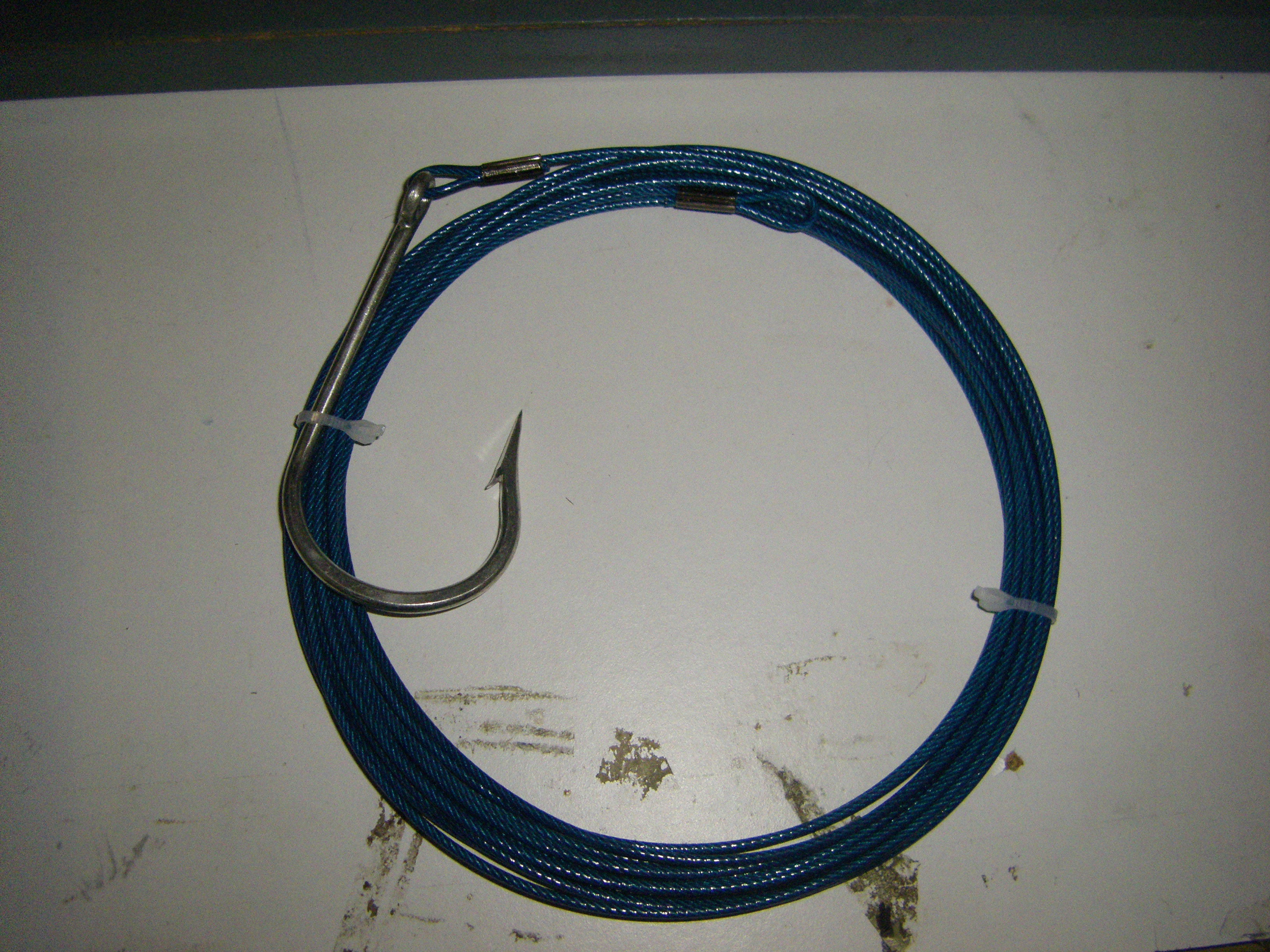 8 mt [26.25 ft] 316 s/s 49 strand 3mm nylon coated 1056 lb shark trace with 16/0 demon circle mustard hook with dual wall shrink wrapped bench swagged crimps. igfa legal