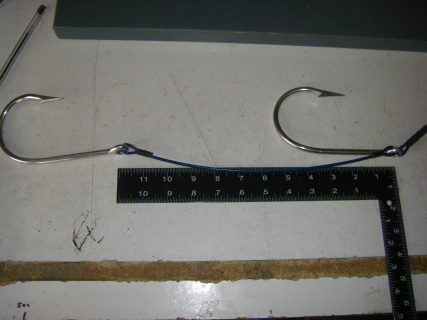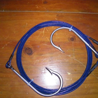 8 mt [26.25 ft] 316 s/s 49 strand nylon coated 1056 lb shark trace with 2 x 14/0 7699 offset mustard hooks with dual wall shrink wrapped bench swagged crimps. igfa legal