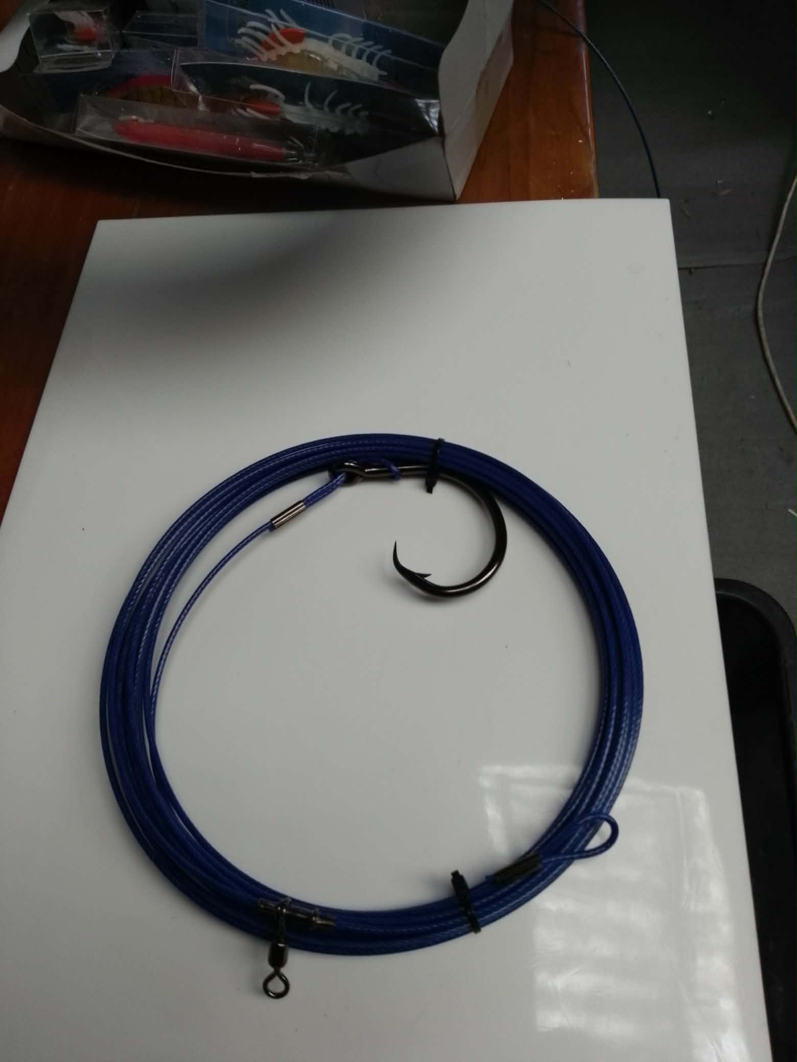 Bench swaged on 4meters of 2mm wire with double copper tournament grade crimps and a 12/0 3407 duratin coated forged mustard j hook.